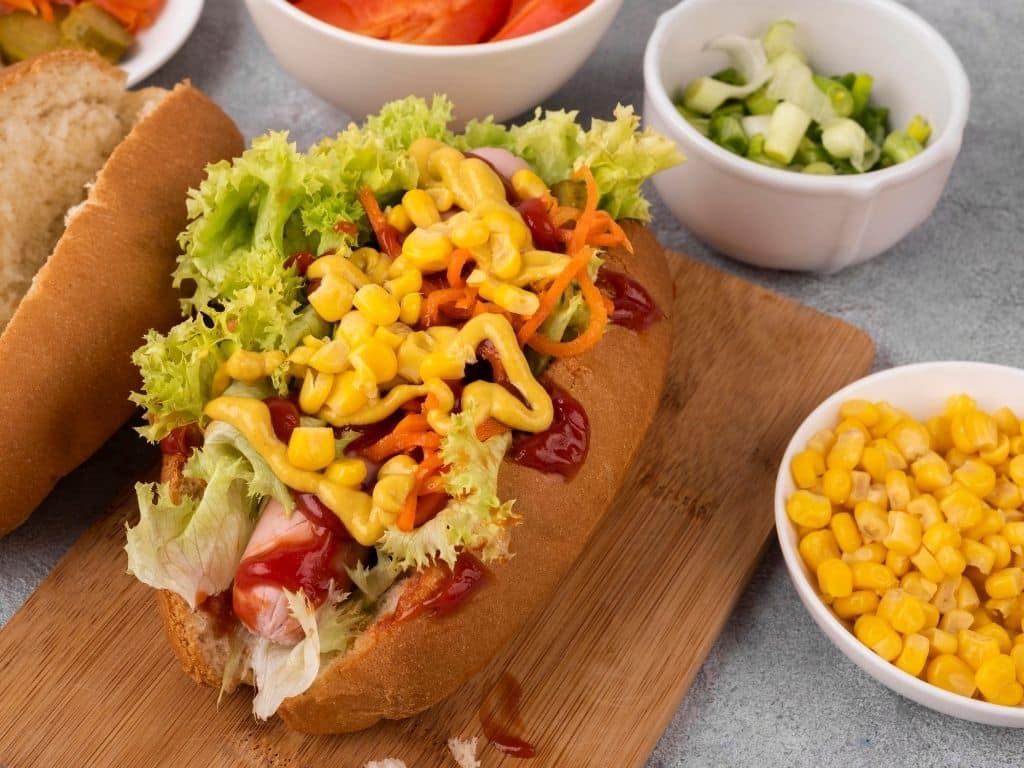 This hot dog is bringing major street food energy. Load it up with roasted corn mixed with mayo, chili powder, and Cotija cheese. Also, try a squeeze of lime. It’s creamy, tangy, and just the right amount of messy. Throw on some sliced jalapeños and a drizzle of hot sauce. Char the corn first for a smoky depth that takes this to another level.
