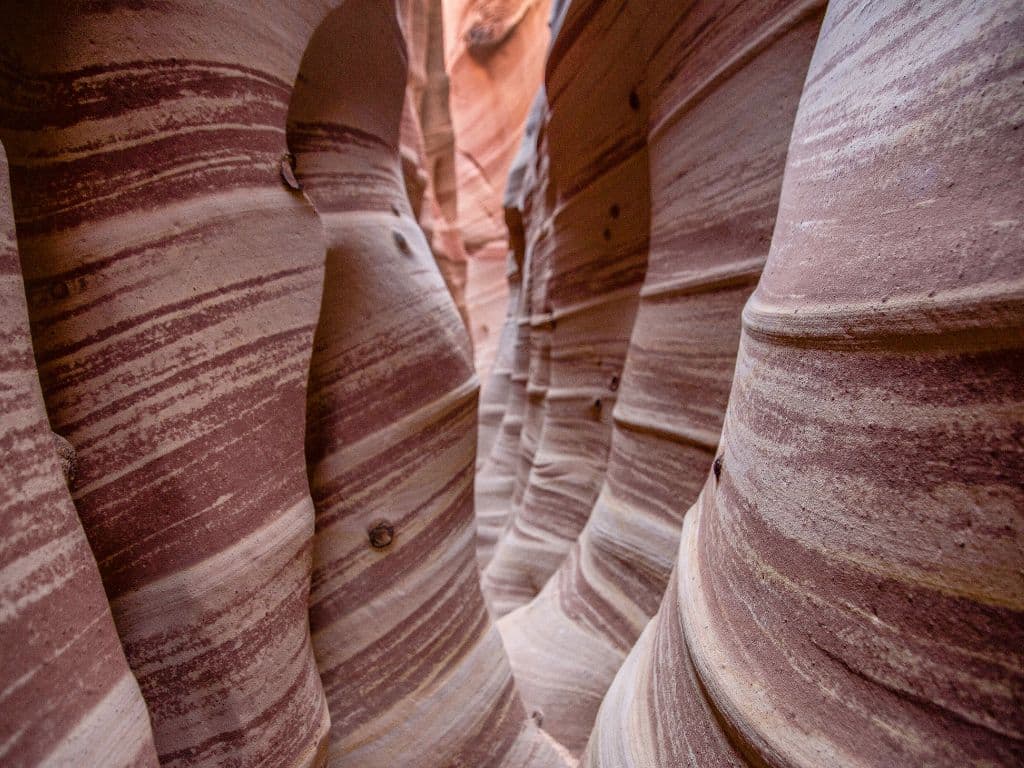 Dry Fork isn’t as tight as Spooky or Peek-a-Boo, but it’s easier to explore. The canyon has smooth, layered sandstone and room to maneuver. It’s a great warm-up if you’re unsure about tighter canyons.