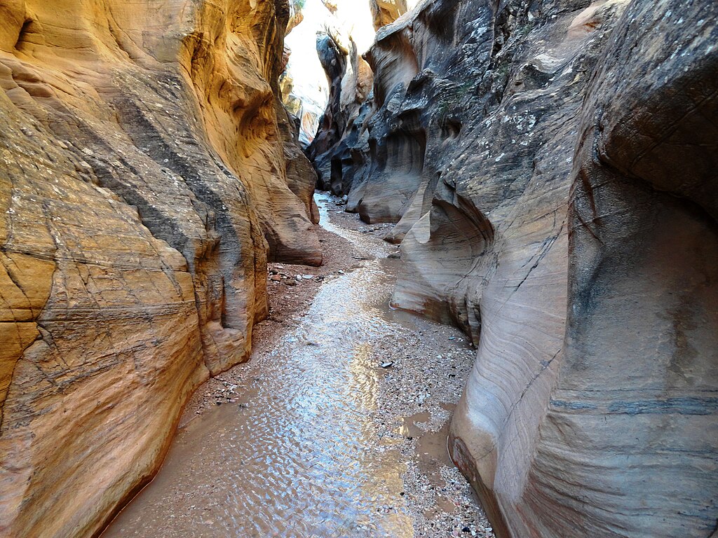 Get there early—this one’s popular for a reason. Zebra Canyon is narrow, photogenic, and often filled with water, which can make the striped walls even more dramatic. The first mile follows a sandy wash from the Hole-in-the-Rock Road. You’ll pass Harris Wash before ducking into the slots.
