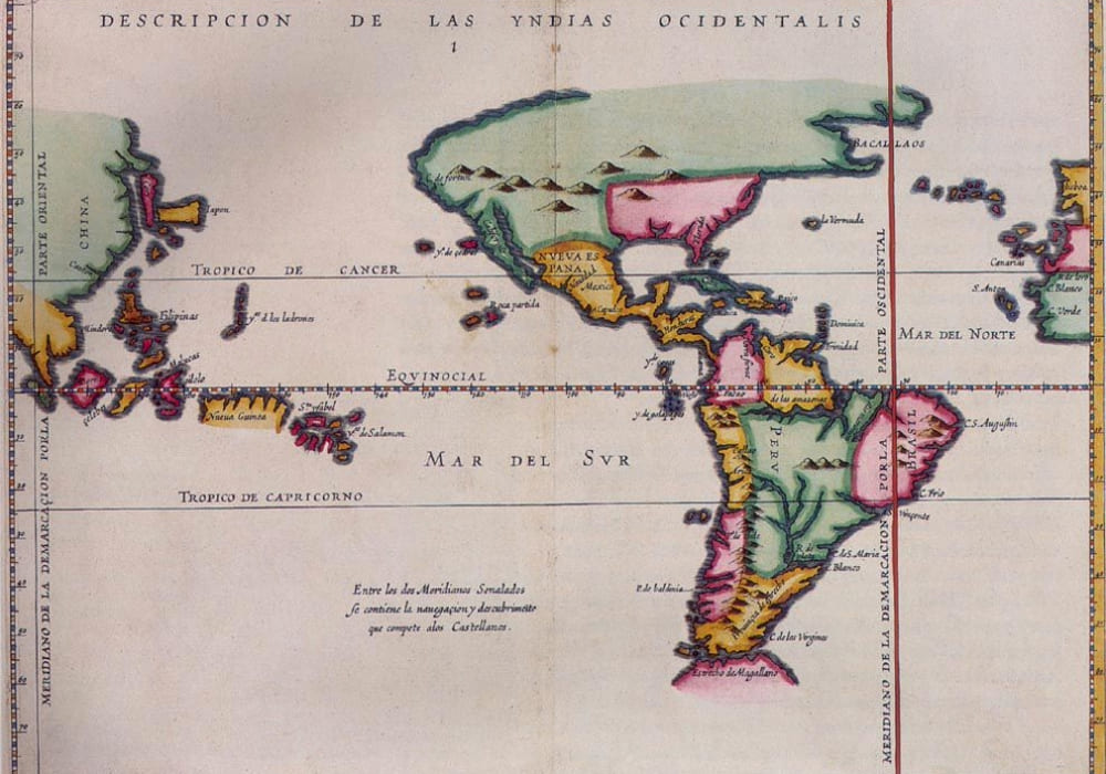 The Treaty of Tordesillas was a map that divided the newly discovered lands outside of Europe between Portugal and Spain along a meridian found in the Atlantic Ocean. The agreement was based on Pope Alexander VI’s decree, shaping future colonial empires and influencing centuries of global politics. The map also played a vital role in defining the sphere of influence found in the European Age of Exploration.