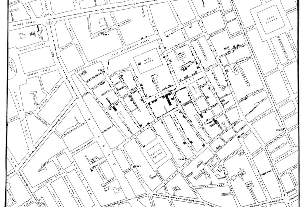 John Snow’s 1854 map of the London Soho district pinpointed a major cholera outbreak source found at a contaminated water pump. It used spatial data in public health, which was rare at the time, and greatly aided epidemiology by showing how cholera spread geographically. Snow’s map confirmed that the disease is waterborne, which was only a theory until then, and saved countless lives.