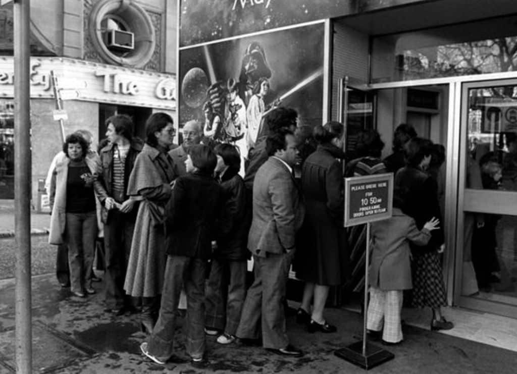 When Star Wars hit theaters in 1977, it wasn’t just a movie—it was a cultural explosion! Just look at those massive lines outside theaters, with people waiting for hours just to experience the magic. Suddenly, everyone was waving imaginary lightsabers and trying to use the Force to grab snacks from across the room!