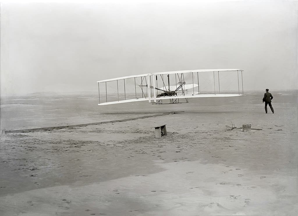 This 1903 photo shows the Wright brothers’ first powered flight in Kitty Hawk, North Carolina. It lasted 12 seconds, but it changed everything. Most people doubted human flight was possible, but this short flight proved it. Today, people don’t think twice before boarding a plane.