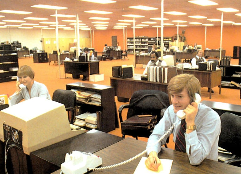 Talk about the complete 80s office experience! Wood paneling? Check. Chunky monitors? Check. Maze of cubicles? Double check! This snapshot shows exactly what stepping into an office felt like—right down to those fancy ergonomic chairs (just kidding, back pain was part of the job description back then!).