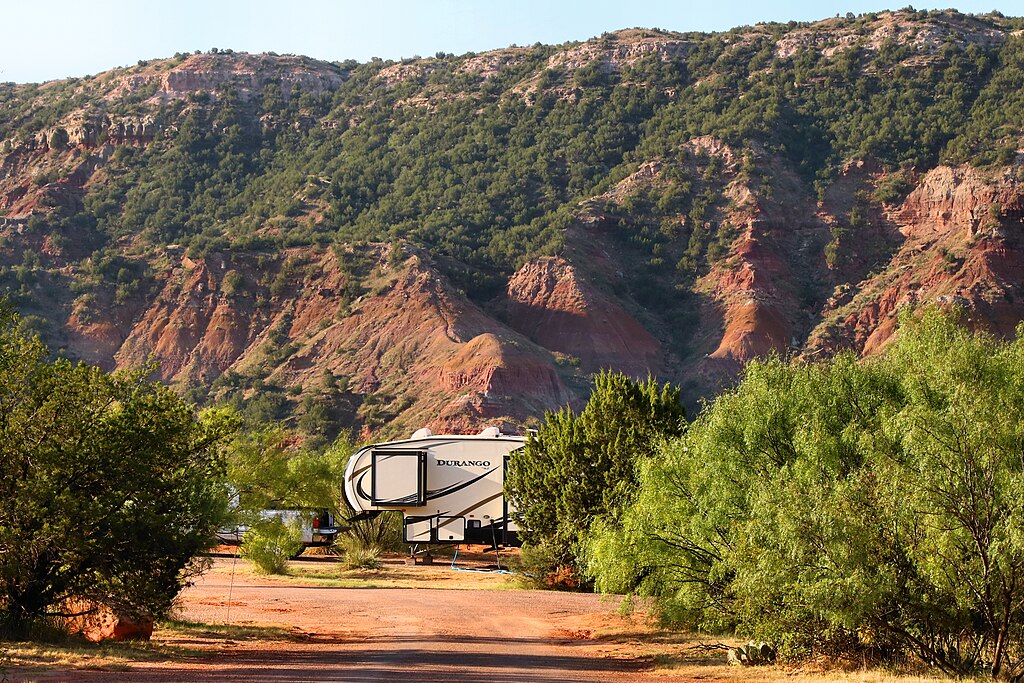 Palo Duro Canyon State Park offers a handful of cabins you can stay in if you prefer comfort. Cabins provide a brilliant blend of rustic charm, a cozy atmosphere, and the park’s rugged beauty, allowing a unique experience. There are three on the canyon’s rim and four on the canyon floor. Additionally, just outside the entrance, the Rustic Luxury camp offers six small, beautiful cabins known for their lavish comforts, stunning views, and easy access to outdoor experiences.